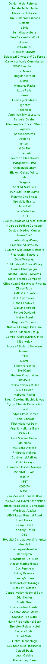 Microsystems, the US Naval Reserve, US West, Blue Diamond Almonds,